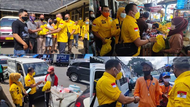 KUNINGAN (MASS) – Ditengah kesulitan warga akibat pemberlakuan PPKM Darurat, Ketua DPD Partai Golkar Kuningan, Ir H Asep Setia Mulyana menyapa masyarakat kecil di Jalan Siliwangi, Sabtu (24/7/2021). Ditemani jajaran pengurus Golkar lainnya, ia membagikan masker dan sembako yang didalamnya terdapat pula vitamin.