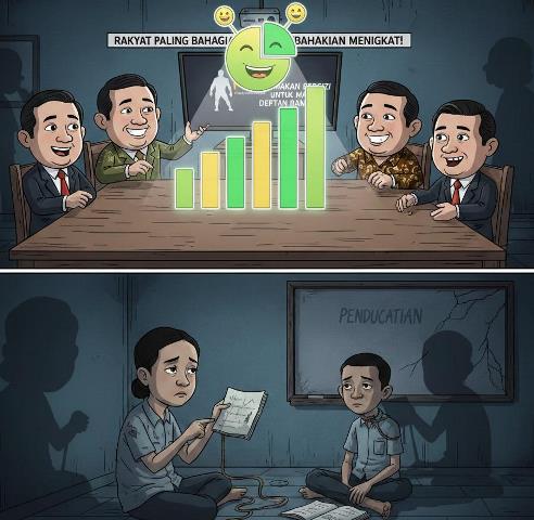 Narasi “rakyat paling bahagia” yang terus diulang melalui media dan konferensi pers justru menjadi bentuk kekerasan simbolik. Ia meniadakan penderitaan nyata dengan angka-angka abstrak. Kebahagiaan direduksi menjadi variabel statistik, bukan pengalaman hidup. Ketika negara berkata rakyat bahagia, sementara rakyat bertanya apakah mereka mampu membeli buku tulis besok pagi, maka yang terjadi bukan optimisme, melainkan pengkhianatan makna kebahagiaan itu sendiri.