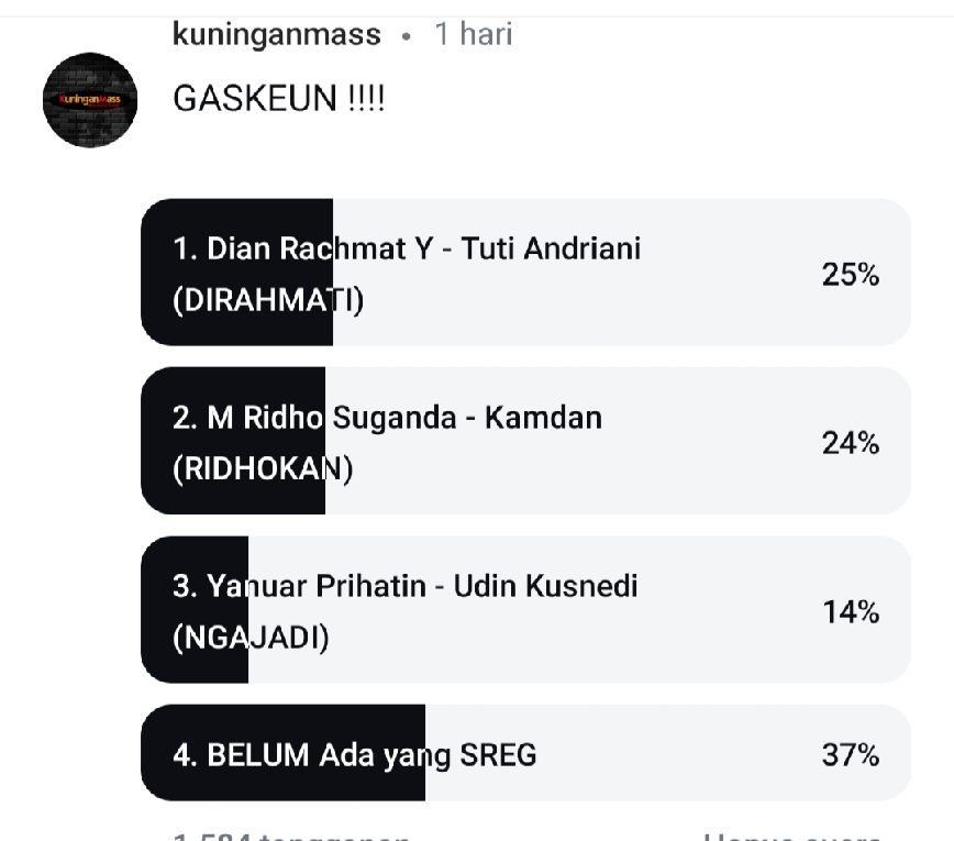 Ini karena, berdasarkan hasil Polling Kuningan Mass di akun instagram, angka “Belum Ada Yang Sreg” alias nomor 4, jauh melampaui angka ketiga paslon.