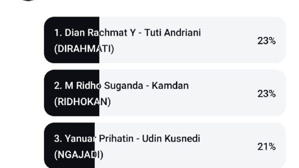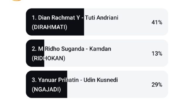 Sedangkan pada polling sebelum bakal paslon mendapatkan nomor urut, justru dimenangkan “Ridhokan” dengan persentase 46%. Disusul “Dirahmati” dengan angka 32%. Baru kemudian “Ngajadi” yang hanya 22%. Suara yang masuk saat itu sebanyak 2.921, tanpa menyediakan pilihan “Belum Ada Yang Sreg). (deden)
