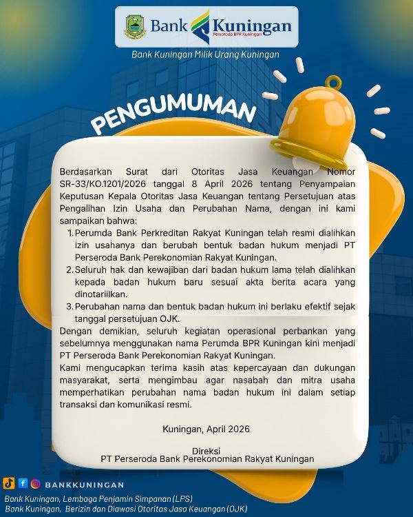 Dengan begitu, seluruh kegiatan operasional perbankan yang sebelumnya menggunakan nama Perumda BPR Kuningan kini menjadi PT Perseroda BPR Kuningan.