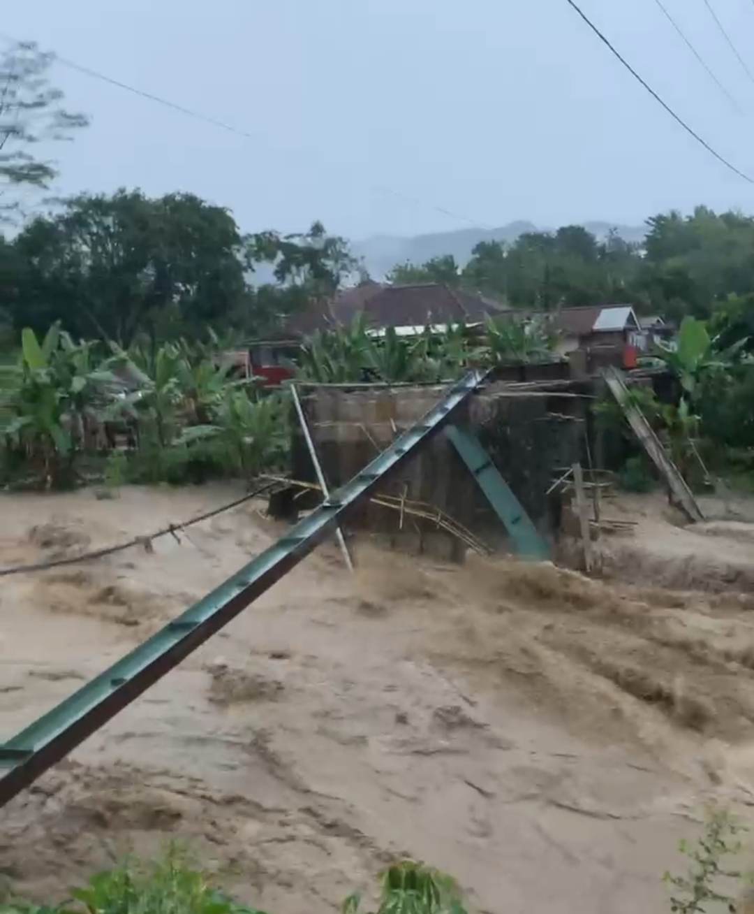 “Ternyata di luar dugaan, banjir sungai Cipedak yang terjadi sore tadi sampai menghanyutkan pilar tengah jembatan, dan 3 buah besi wf gelagar ikut terseret juga,” kata Teddy Bisma.