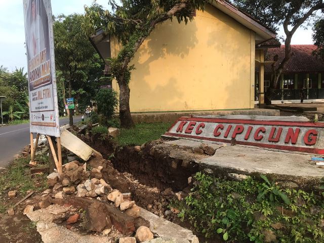 Tepatnya pagar SDN 2 Cimaranten yang ada di Desa Cimaranten Kecamatan Cipicung. Akibat banjir kemarin, pagar depan yang berada di pertigaan jalan itu, nampak roboh.