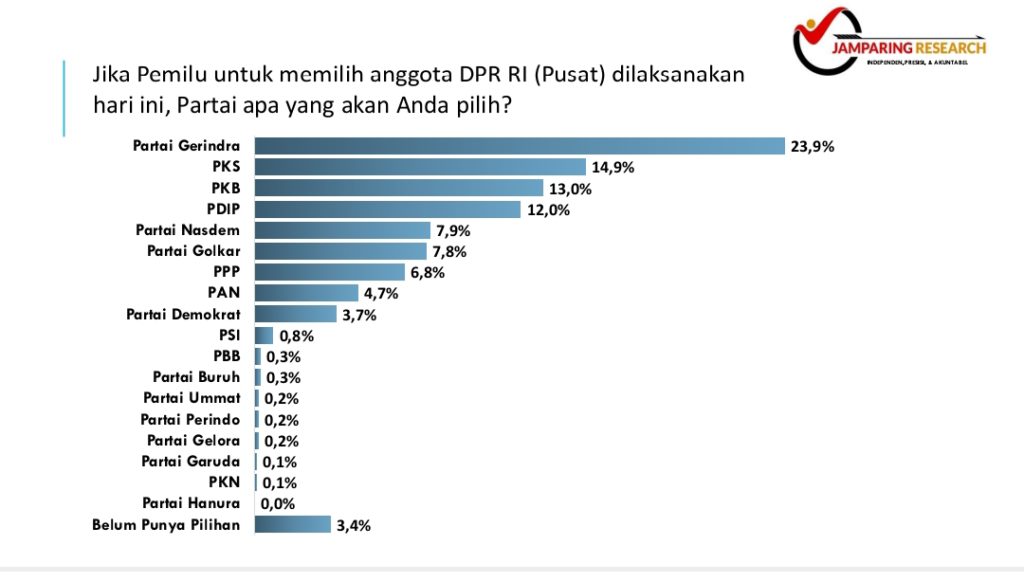 Diketahui, hasil survey Jamparing Research memang membawa angin segar untuk pertarungan legislatif pusat Partai Gerindra. Elektabilitasnya bahkan mencapai 23,9%.