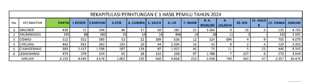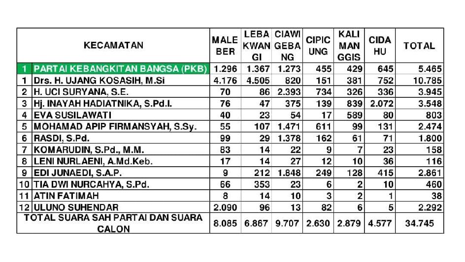 Caleg peraih suara 3 besar itu diantaranya H Ujang Kosasih, disusul H Uci Suryana sebanyak 3.945 suara dan Hj Inayah Hadiatnika sebanyak 3.548 suara.