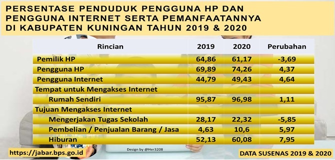 Akses dan alat layanan internet seolah menjadi kata kunci bagi keberhasilan dari PJJ si suatu daerah. Menilik data hasil dari Survey Sosial Ekonomi Nasional (Susenas 2019 & 2020) kondisi di Kabupaten Kuningan dapat terlihat dalam infografis berikut ini.