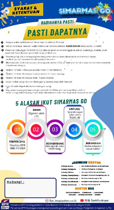 KUNINGAN (MASS) – Bank Kuningan terus melakukan penyesuaian produk, salah satunya adalah produk simpanan. Setelah sebelumnya ada Tabungan Ciremaiku yang merupakan produk Tabungan gabungan 13 Bpr Se-Ciayumajakuning, kini Bank Kuningan me-launching produk Tabungan baru Bernama Simarmas-Go atau Simpanan Arisan Masyarakat.