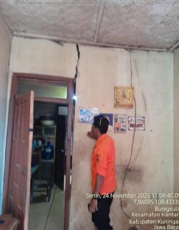 “Pergerakan pondasi rumah mengakibatkan pergeseran bangunan sepanjang 12 meter dengan kebar 7 centimeter. Dinding dapur, kamar mandi, ruang tamu dan teras keramik depan mengalami retakan sepanjang 12 meter,” ujar Indra, Senin (24/11/2025).