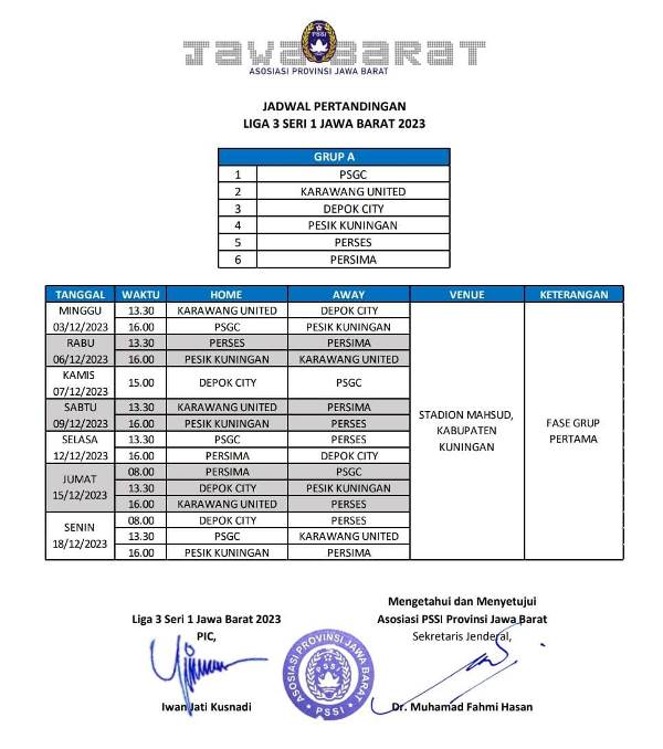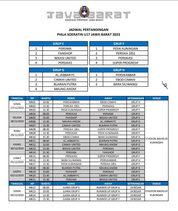 Piala Soeratin U-17, akan menggelar babak penyisihan pada 27 November sampai 2 Desember 2023, serta Liga 3 seri 1 akan dihelat di Kuningan pada tanggal 3 – 18 Desember 2023 mendatang.