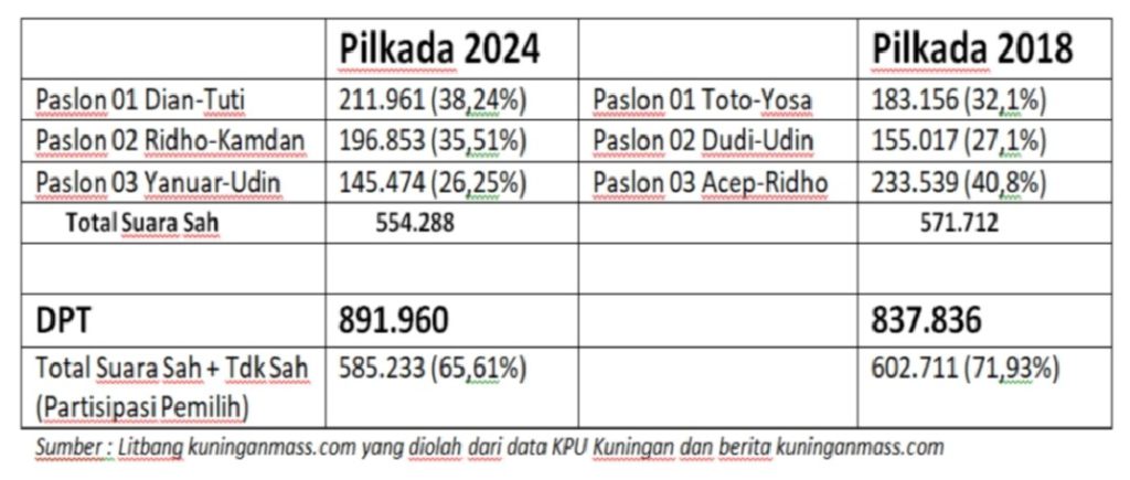 KUNINGAN (MASS) – Berikut ini akan kami sajikan data hasil pilkada, perbandingan antara Pilkada 2018 dan 2024 sebagai bahan kajian bersama. Bisa dianalisis jika angka Partisipasi Pemilih pada Pilkada 2024 mengalami penurunan sekitar 6% dari Pilkada 2018.