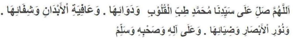 ARTINYA: “YA ALLAH LIMPAHKANLAH RAHMAT KEPADA JUNJUNGAN KAMI NABI MUHAMMAD SAW, SEBAGAI OBAT HATI DAN PENYEMBUHNYA, PENYEHAT BADAN DAN KESEMBUHANNYA, SEBAGAI PENYINAR PENGLIHATAN MATA BESERTA CAHAYANYA. DAN SEMOGA RAHMAT TERCURAH LIMPAHKAN KEPADA PARA SAHABAT BESERTA KELUARGANYA.”