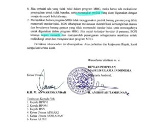Dalam surat bernomor Rek-3161/DP-MUI/IX/2025 itu, disampaikan beberapa poin rekomendasi MUI terhadap pelaksanaan MBG. Rekomendasi disampaikan setelah FGD lintas sektor mulai dari perwakilan MUI, BGN, BPJPH, BPOM, BSN, ALPHI, APMAKI, dan ASPRADAM.