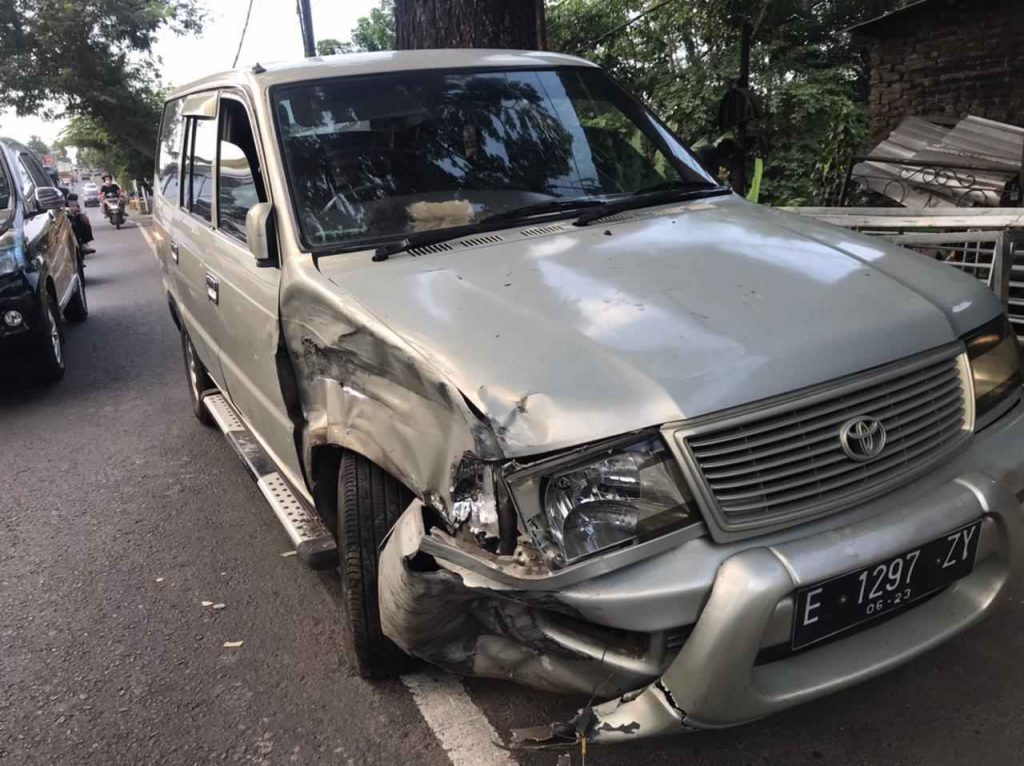 Kecelakaan itu, melibatkan ‘aduan’ bagian depan kanan dua mobil berjenis Kijang dan Xenia. Keduanya beradu, tepat di sekitar jembatan dekat bengkel las.