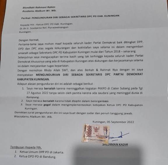 Mundurnya lelaki kelahiran 1970 itu, dikonfirmasi langsung oleh Aldi, sapaan akrab Saldiman Kadir, Kamis (8/9/2022) siang. Pada kuninganmass.com, dirinya membenarkan bahwa surat pengunduran dirinya itu darinya.
