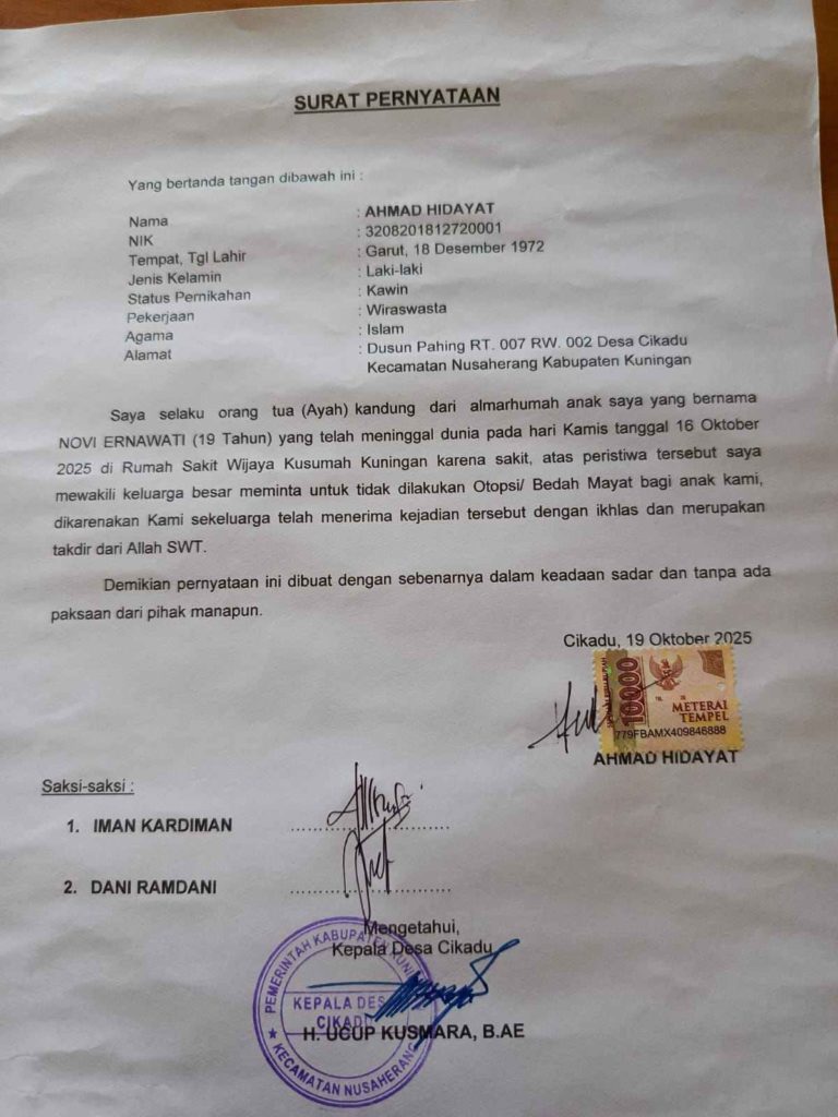 KUNINGAN (MASS) — Pemerintahan Desa (Pemdes) Cikadu, Kecamatan Nusaherang, mengambil langkah proaktif dalam menyikapi insiden meninggalnya Novi, siswa SMAN Kadugede yang diduga keracunan makanan. Pemdes Cikadu berinisiatif membuat surat pernyataan penolakan autopsi atau bedah mayat bagi almarhumah setelah pihak keluarga menyatakan telah mengikhlaskan kepergiannya dan menolak proses hukum lebih lanjut.