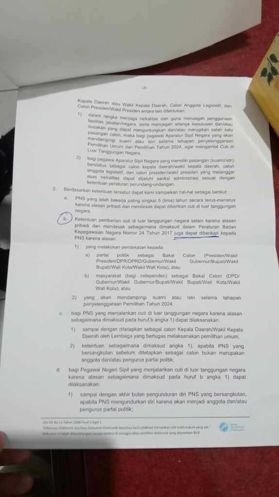 Zul, memamerkan surat dari BKN tersebut, dimana dalam poin nomer 2 poin b, dikatakan posisi apa saja yang memungkinkan ASN untuk Cuti di luar tanggungan negara.