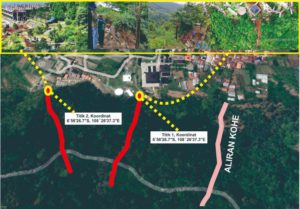 Untuk memperjelas letak masalah, Abah Iip bersama tim pemantau dari Gerakan KITA dan aktivis lingkungan lainnya menyajikan bukti spasial. Dalam citra peta yang sudah tersebar ditunjukkan dua titik longsor (Titik 1 dan Titik 2) yang berada tepat di bawah kawasan pembangunan proyek Arunika. Kedua titik ini ditandai dengan koordinat akurat berdasarkan pengamatan lapangan.