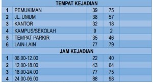 Dalam keterangannya, kriminalitas banyak terjadi justru di pemukiman. Disusul dengan jalan umum, kantor, lalu sekolah/kampus, tempar parkir dan tempat lainnya.