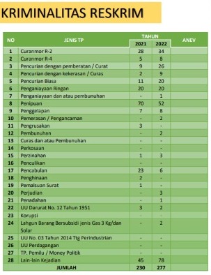 Kasus pencurian pada tahun 2022 kemarin, Polres merekap ada 34 kasus pencurian roda 2, dan 8 kasus pencurian roda 4. Angka tersebut naik dari tahun 2021.