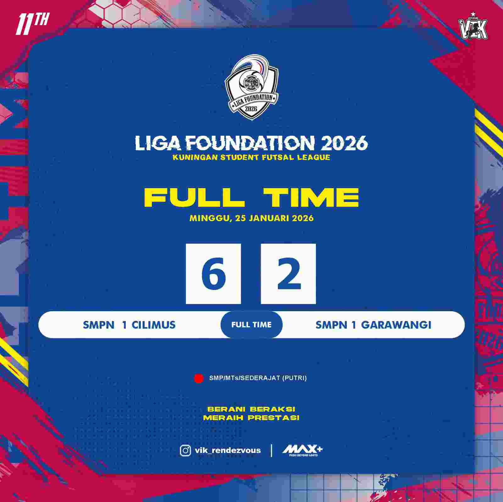 KUNINGAN (MASS) – Turnamen Liga Foundation tahun 2026 kembali berlanjut pada Minggu (25/1/2026) di Gedung Olahraga Ewangga Kuningan. Pertandingan kali ini mempertemukan tim kategori SLTP Putri antara SMPN 1 Cilimus melawan SMPN 1 Garawangi, tercipta 8 gol dalam pertandingan ini dimenangkan oleh SMPN 1 Cilimus 6 dan SMPN 1 Garawangi 2.