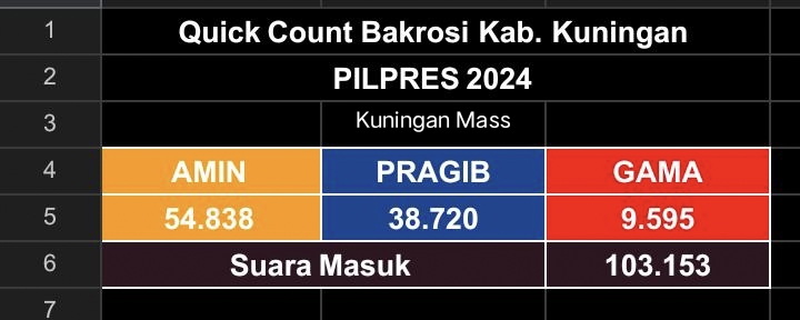Persentase ini merupakan hasil Quick Count yang dirilis Bakorsi di Rumah Pemenangan AMIN Kabupaten Kuningan, Kamis (15/2/2024) pukul 12.00 WIB. Itu dihitung dari jumlah suara yang masuk sebanyak 103.153 suara.
