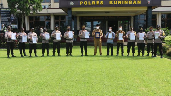 KUNINGAN (MASS)- Kapolres Kuningan AKBP Doffie Fahlevi Sanjaya SIK MSi memberikan piagam penghargaan kepada kelompok masyarakat yang berhasil memenangkan Juara pertama lomba siskamling tingkat...