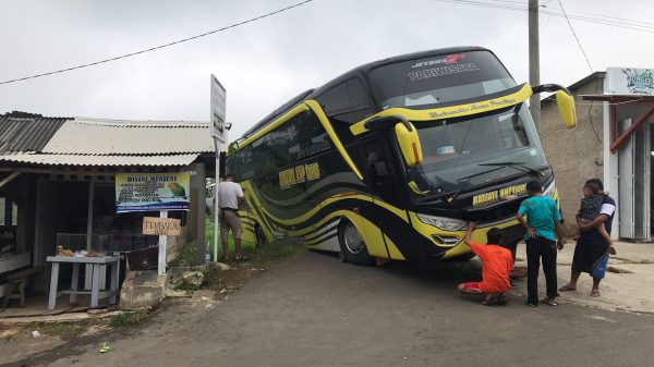 SINDANGAGUNG (MASS) – Sebuah bus Raffael KNP Trans terlihat terjebak di pertigaan Desa Babakanreuma Kecamatan Sindangagung, pada Minggu (13/2/2022) pagi. Bus pariwisata dengan nopol...