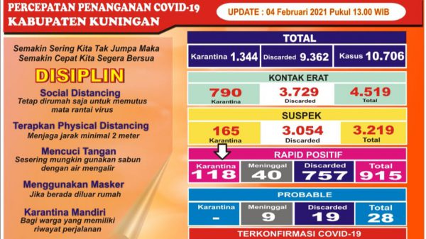KUNINGAN (MASS) – Meski pembagian masker terus dilakukan. Bahkan jumlahnya ribuah. Namun kenaikan kasus positif di Kabupaten Kuningan belum juga turun. Untuk update Kamis...