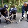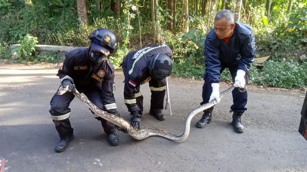 KUNINGAN (MASS)- Petugas UPT Damkar Kuningan, Minggu (10/10/2021) menangkap seekor ula sanca kembang sepanjang 3 meter disebuah kandang ayam. Kadang ayam itu milik Ikin...