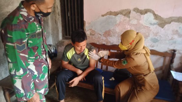 KUNINGAN (MASS)- Anggota Koramil 1514/Pancalang, Serka Heri Susilo mendampingi vaksinasi tahap 1 bagi Orang Dengan Gangguan Jiwa (ODGJ) di Desa Tarikolot Kecamatan Pancalang, Kabupaten...