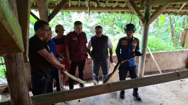 KUNINGAN (MASS) – Ular Sanca Kembang/Batik (Python Reticulatus) sepanjang 3 meter menyatroni kandang kambing dan entok milik warga Jalan Badugajaya Dusun Puhun RT 05...