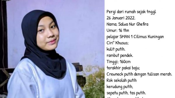 KUNINGAN (MASS)- Siswa kelas 1 SMAN 1 Cilimus yang bernama Salwa Nur Ghefira (16) menghilang sejak Rabu tanggal 26 Januari 2022. Anak ke empat...