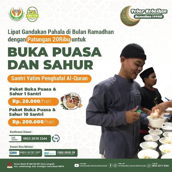 Adapun, ntuk patungan sahur dan buka santri yatim, cukup mulai 20ribu saja perhari. Bisa juga langsung patingan 200ribu, nanti disalurkan ke 10 santri.