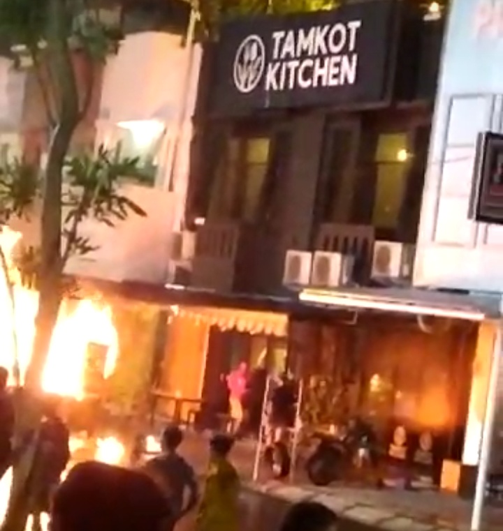 Bukannya api padam , malah Api semakin membesar, kemudian saksi bersama karyawan lainnya menggotong grobak yang terbakar dari dapur ke halaman depan.