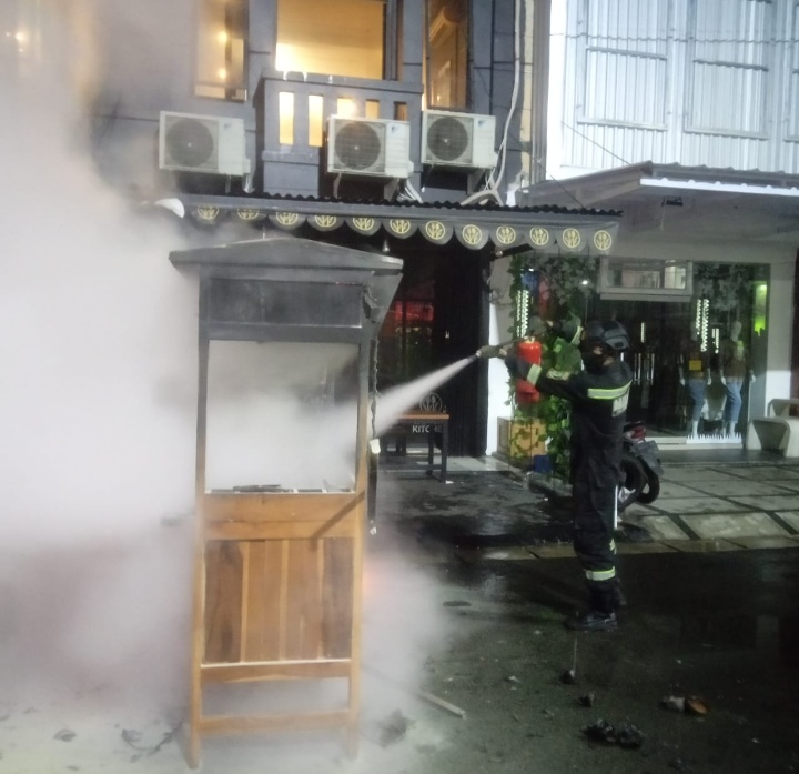 Anggota Damkar juga membersihkan sisa tumpahan minyak dari gerobak yang tumah dihalaman depan Tamkot Kitchen dan selesai pada pukul 21.15 ( 25 menit).