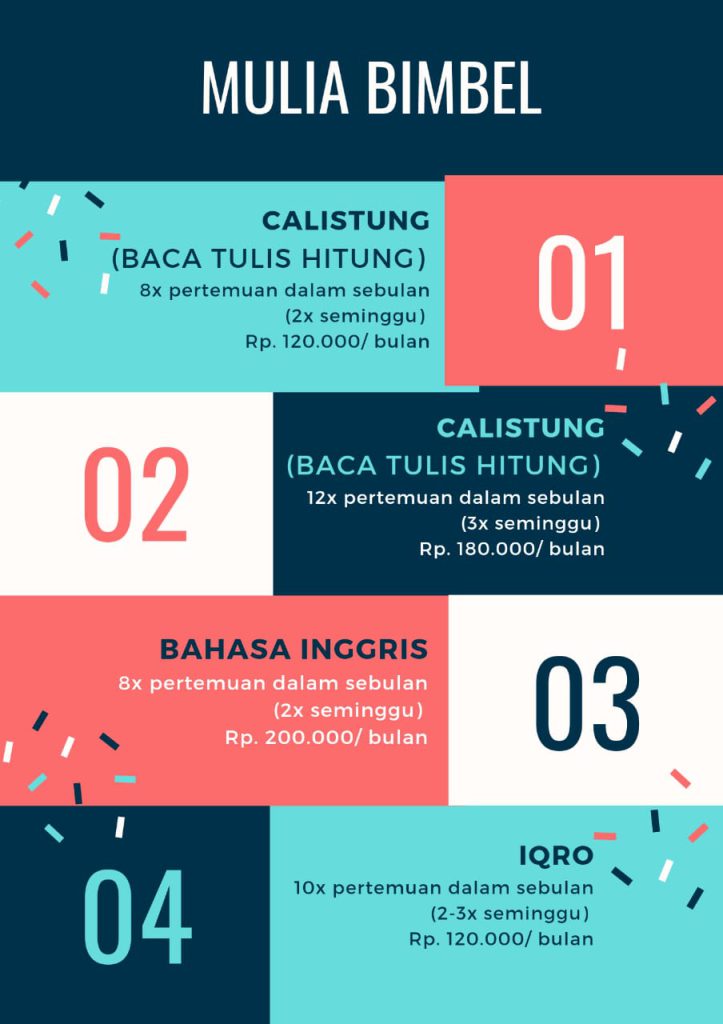 “Mulia bimbel dibimbing oleh pengajar yang sudah berpengalaman di bidangnya. Dapat membimbing anak untuk belajar menjelang UTS/UAS di sekolahnya,” tuturnya.