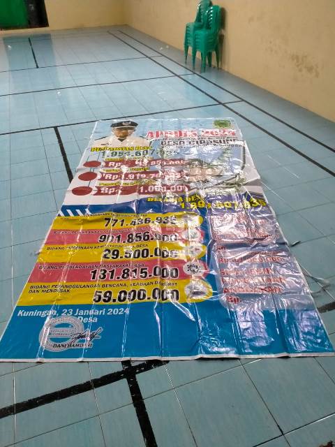 “Punten pak kamari hujan angin copot APBDes,tapi APBDes mah aya di kantor ke bade dipasang deui tapi cincin anu buat ikatan na copot semua (Punten kemarin hujan angina copot baliho APBDes, mau dipasang lagi tapi cincin untuk talinya lepas semua),” kata Kades Dani, Jumat (22/3/2024).