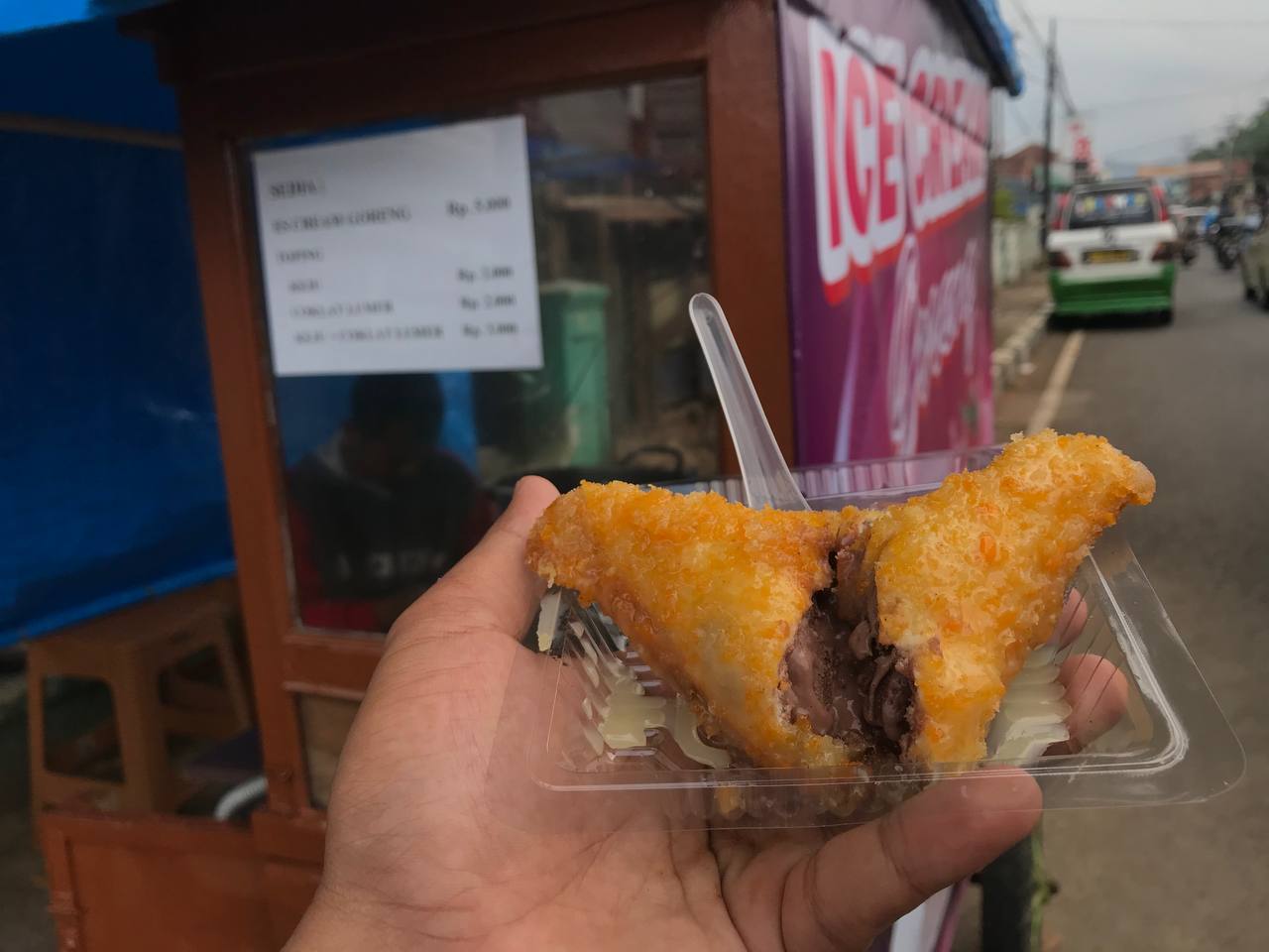 Jajanan ini, baru berdiri beberapa hari lalu. Dijajakan menggunakan gerobak di pinggir jalan raya, Es Krim Goreng buka mulai dari pukul 10.00 WIB – 21.00 WIB malam.