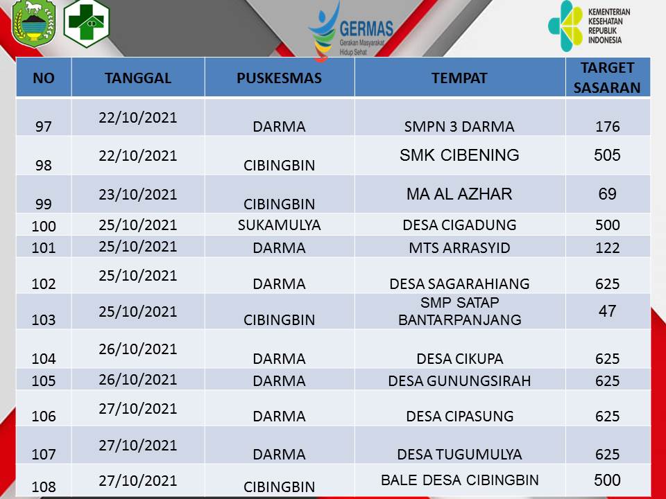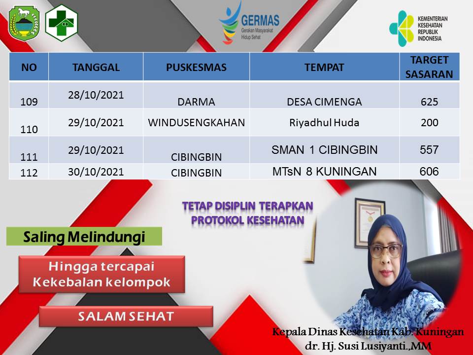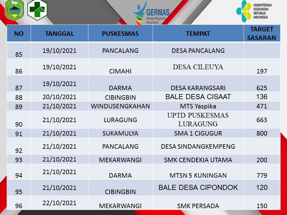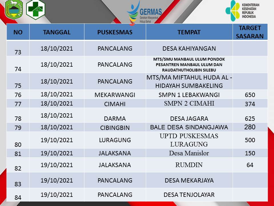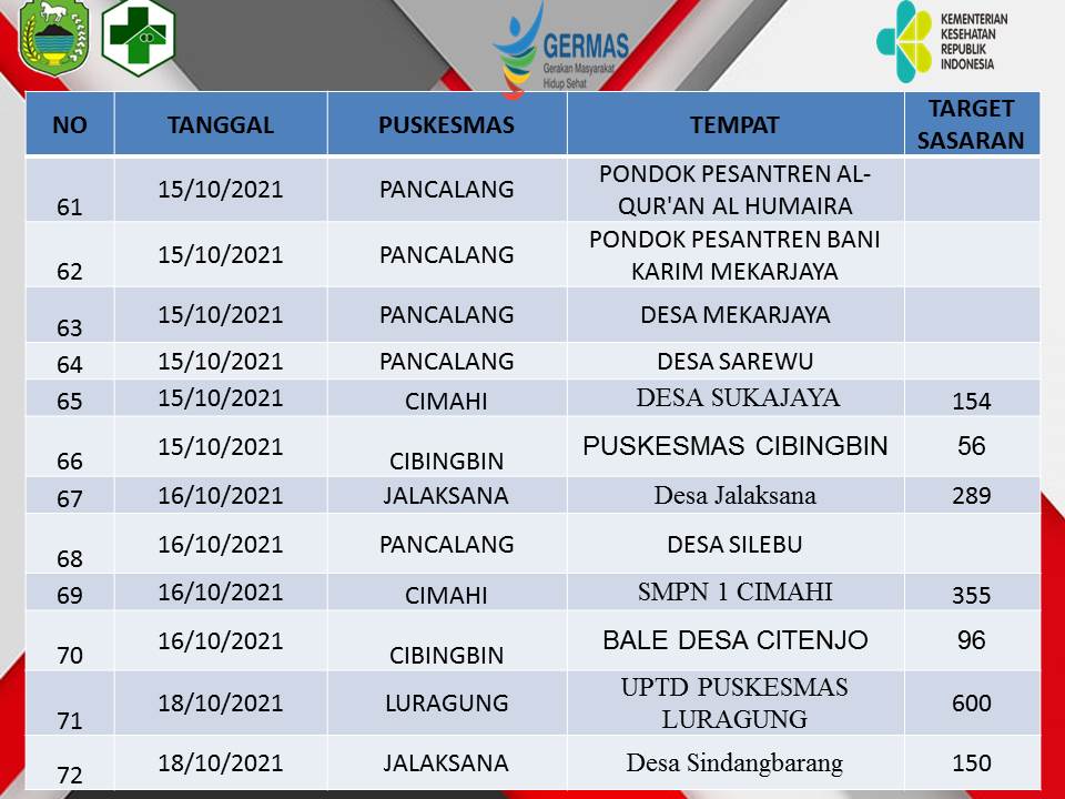Kesehatan Update Jadwal Vaksinasi Oktober 2021 di 37 Puskesmas ByDeden Rijalul Umam Published 15 October 2021 In this article:Germas gerakan masyarakat hidup sehat, jadwal vaksinasi oktober kuningan, update jadwal vaksinasi oktober Advertisement Advertisement Berita Terbaru Pencairan DD Tahap 2 Tahun 2025 di Kabupaten Kuningan Sudah Tuntas Sejak Bulan Agustus 8 January 2026 Cabai dan Daging Melandai, Minyak KITA Turun ke Harga Rp 15,7 Ribu Hari Ini 8 January 2026 Truk Pembawa Kayu TNGC Disergap Babinsa dan Polhut, Sopir dan Pelaku Lain Kabur 8 January 2026 Dua Bocah Penjual Lupis di Tengah Forum Pemuda Kuningan 8 January 2026 Ngarucu Langlayangan 8 January 2026 Akses Jalan Menuju Kebun Raya Kuningan Masih Rusak, Bupati Janjikan Perbaikan Bertahap 8 January 2026 BPP Ciwaru dan Desa Sagaranten Ikuti Panen Raya Nasional Secara Daring, Presiden Umumkan Swasembada Pangan 8 January 2026 Gugatan Kuota Internet Ke MK Menurut Politik Hukum Perlindungan Konsumen 8 January 2026 Demi Koperasi Merah Putih Dana Desa Dipangkas Sampai 60%, Kepala Desa Diminta Bersabar, Pembangunan Lain Ditunda Dulu 8 January 2026 PPDI Serahkan Donasi Perangkat Desa se-Kabupaten Kuningan, Ada Untuk Bencana Aceh, Juga Perbaikan Rumah Warga Ancaran yang Roboh 8 January 2026 Ada Mantan Kuwu, Ini Daftar Camat Hasil Rotasi-Mutasi di Kabupaten Kuningan 8 January 2026 Tak Lagi Pasutri Jadi Kepala dan Sekretaris, Rinneka Geser Dari Bappeda 8 January 2026 Giliran Darma dan Sekitarnya Pemadaman Listrik, Cek Jadwalnya Disini 8 January 2026 Kepemimpinan Nabi: Pelajaran dari Isra Mi’raj dan Implementasinya 8 January 2026 Ini Daftar Jenis dan Harga Eceran Tertinggi Pupuk Subsidi, Agen Jangan Nakal! 8 January 2026 Program Rujukan Ke Rumah Sakit dan PKMK Signifikan Tekan Anak Kurang Gizi; Anemia Jadi Penyakit Terbanyak Penyerta Bayi Stunting 7 January 2026 Datangi Rumah Nenek Manis, Rumah Zakat Kuningan Salurkan Bantuan Pangan 7 January 2026 Gantikan Rizal Di Kabid SD, Surya Akan Fokus di Pendidikan Karakter dan Mutu Sekolah Dasar 7 January 2026 Minim Fasilitas Sampah dan Charger, Harga Tiket Rp 25 Ribu Kawasan Cilengkrang Dipertanyakan 7 January 2026 Jabatan Tanpa Kompetensi, Alarm Bahaya Birokrasi Kuningan 7 January 2026 Advertisement Trending Desa Kuwu dan 12 Aparat Desa Cihideung Hilir Kompak Tanda Tangan Surat Pengunduran Diri Desa Warga Cihideung Hilir Turun Ke Jalan, Desak Kuwu Turun, Ancam Segel Balai Desa! Pemerintahan Digelar di Tempat Blankspot, Bupati Kukuhkan 150 ASN di Jabatan Baru; Ini Daftar Rotasi-Mutasi Eselon 3! Pemerintahan 150 ASN Kabupaten Kuningan Bakal Kena Rotasi Mutasi Besok, Pengamat Yakin Dian-Tuti Tak Akan Salah Penempatan Pemerintahan Di Tahun 2025; Kuningan Disawer Traktor dan Alat Pertanian Senilai Rp 10 Miliar, Disebar ke Kelompok Tani di Desa-desa Headline Beredar Menu MBG Berjamur, SPPG Sebut Ada Kesalahan dari Supplier, Langsung Putus Kerjasama Pemerintahan Mulai dari Minus Rp 268 Miliar, Gagal Bayar Kabupaten Kuningan Justru Tuntas Tak Sampai Setahun Desa Tak bisa Semena-mena Mundur! Ini Kata DPMD Soal Kuwu dan Perangkat Desa Cihidenghilir yang Mundur Massal Desa Ternyata Gara-gara Ini Warga Minta Kuwu dan Perangkat Desa Cihideunghilir Mundur Massal Wisata Lonjakan Pengunjung Terjadi di Wisata Kaki Gunung Ciremai, Arunika Paling Banyak, Capai 3.000 Orang Per Hari! Headline Tengah Bersihkan Kebun di Cigedang, Warga Bekasi Tewas Jatuh ke dalam Sumur, Innalillahi.. Pemerintahan Tak Lagi Urusi PJU dan Parkir, Khadafi Kini Duduki Jabatan Sekretaris Bakesbangpol Pemerintahan Bukan 1 September, Hari Jadi Kuningan Harusnya 5 Januari? Ikuti Diskusinya Besok! Pendidikan Awali Tahun 2026, Husnul Khotimah Berikan Reward Umroh 14 Pegawai Netizen Mass Dialog Elitis Atau Kontestasi Publik? Govlectrum UM Kuningan Dalam Bayang-Bayang Pembangunan Daerah Share Tweet You May Also Like Kesehatan Jadwal Vaksinasi Bulan Oktober Full JADWAL PELAKSANAAN VAKSINASI COVID-19 DINAS KESEHATAN KABUPATEN KUNINGAN BULAN OKTOBER 2021 NO TANGGAL PUSKESMAS TEMPAT TARGET SASARAN KET 1 04/10/2021 DARMA BALAI DESA... Deden Rijalul Umam13 October 2021
