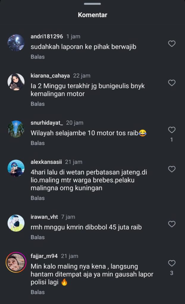 Tak hanya itu, akun @kiarana_cahaya turut mengomentari, “Ia 2 minggu terakhir juga Bunigeulis banyak kemalingan motor.” Komentar ini menegaskan bahwa aksi curanmor tidak hanya terjadi di Selajambe, tetapi juga meluas ke wilayah Bunigeulis.